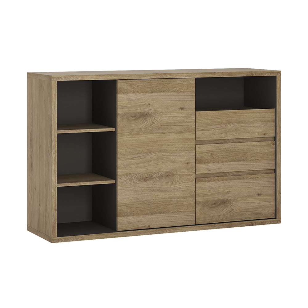 1 Door 3 drawer sideboard. Enchanting with its simple elegence, Ingenious shape complemented by elegant decor – a perfect marriage. This collection with sharp lines and a bold feeling, fills every living room space requirement.