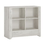 1 Drawer Low Bookcase. This beautifull bedroom collection is contemporay and stylish and suitable for all age groups, finished in a modern hard wearing white crafted Oak melamine. This handy low wide bookcase has 4 large openings over wide drawer, and a nice top for displaying family photos.
