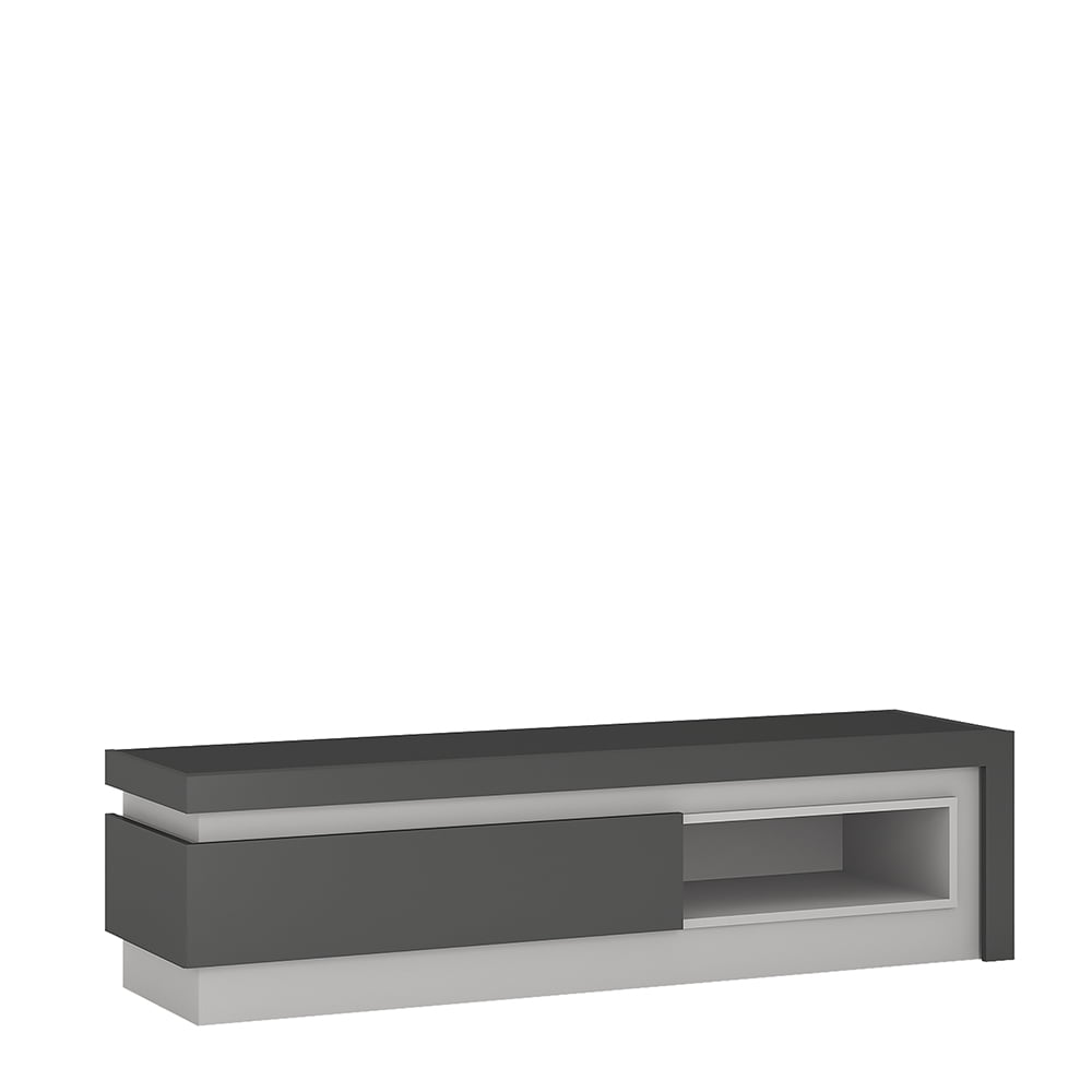 1 drawer TV cabinet with open shelf (including LED lighting) in Platinum/Light Grey Gloss.. Nice compact 130cm wide low TV cabinet, has opening for satellite accessories, and handy storage drawers fitted with easy gliding runners. A high quality collection in a ultra modern design – with each item complementing each other.
