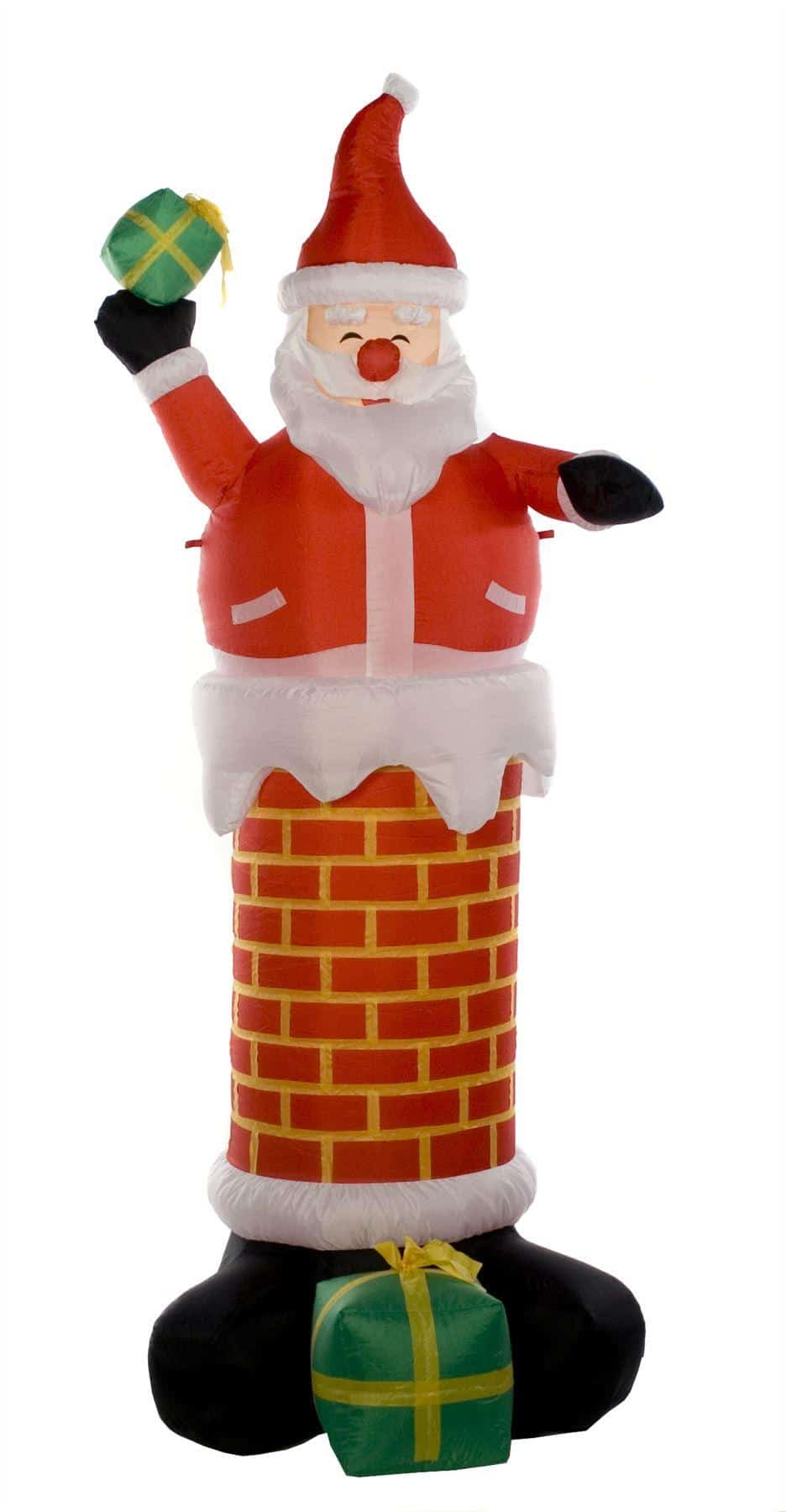 An inflatable Christmas Decoration of Santa Claus stuck in a Chimney that stands 180cm (6 feet) tall. It comes with guide ropes and tent pegs so that it can be secured down.