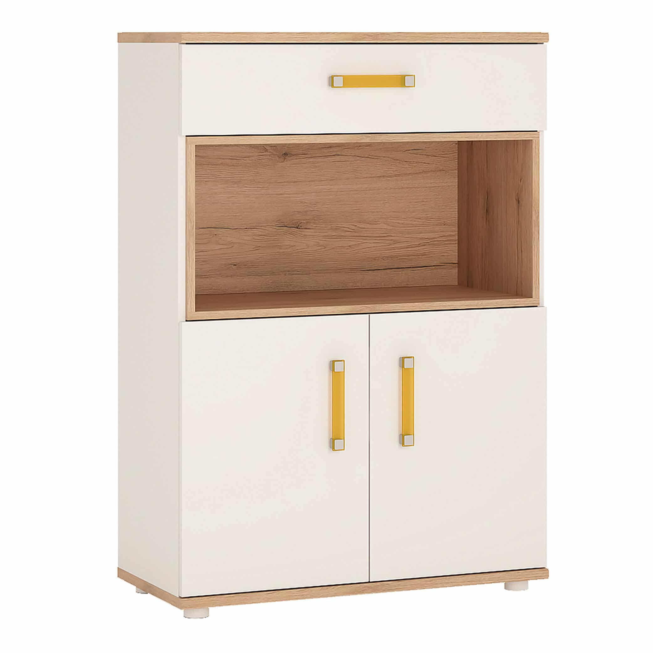 2 door 1 drawer cupboard with open shelf in light oak and white high gloss with orange handles. This neutral and functional kids collection is perfect for all age groups, finished in light oak and stunning white high gloss. Lots of storage space, in the I drawer 2 drawer cupboard, with nice open shelf for display items.