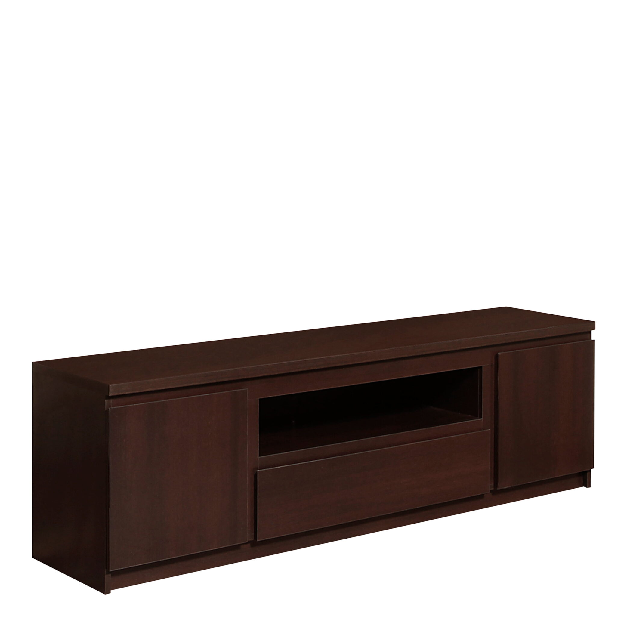 2 Door 1 Drawer Wide TV Cabinet in Dark Mahogany. Simple and elegant range with laminated board (resistant to damage and scratching, moisture and high temperatures) and modern handle-less system. This modern and simple minimalist designer collection offers a great range of furniture with storage options as well as an elegant design.