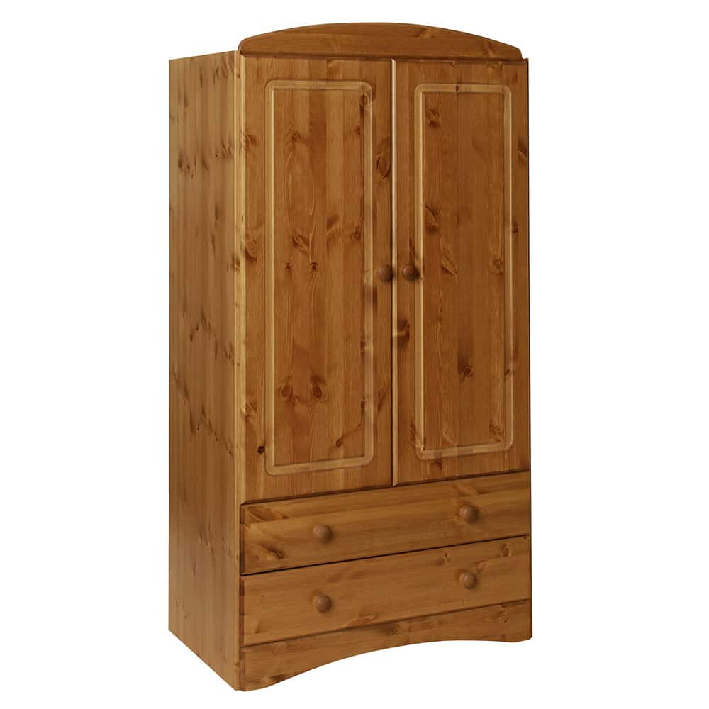 2 Door 2 Drawer wardrobe in Pine is an ideal all-in-one storage solution for the smaller bedroom. Plenty of hanging space above 2 generous drawers fitted with smooth gliding runners and cam lok drawer fronts, crafted from solid pine and finished with a smooth stained lacquer makes this a durable and attractive choice for any bedroom. An added touch is the special adjustable hinges we use on all wardrobe doors to offset any problem with uneven floors. Why not add our 3 drawer bedside and single bed to offer your customer single bedroom package.
