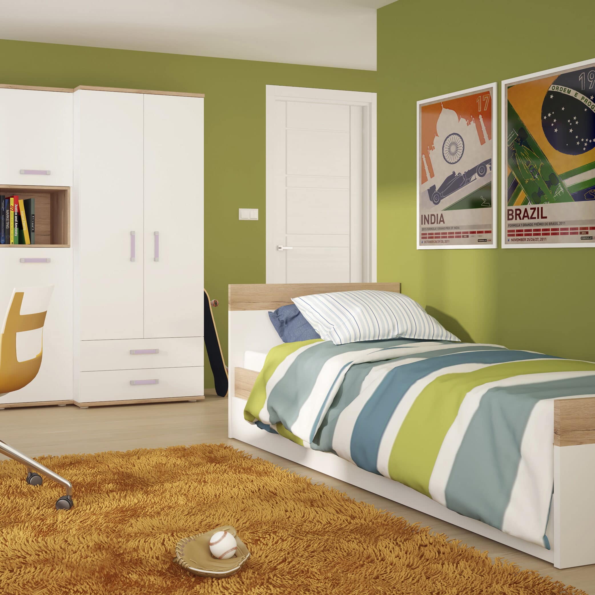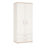 2 door 2 drawer wardrobe in light oak and white high gloss with lilac handles. This neutral and functional kids collection is perfect for all age groups, finished in light oak and stunning white high gloss. This 2 door wardrobe has an interior shelf and full hanging rail with 2 handy drawers at base.