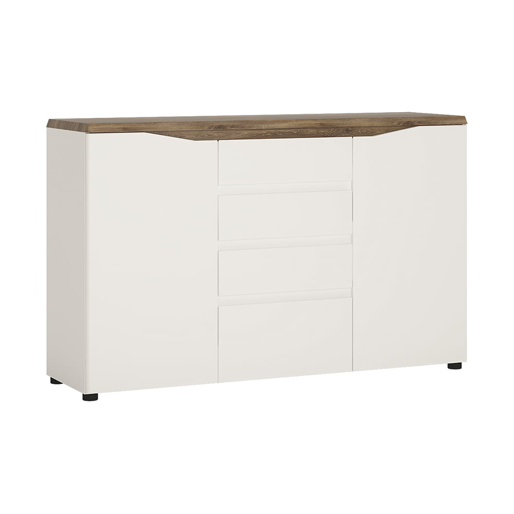 2 door 4 drawer sideboard in Alpine White with high gloss fronts and Stirling Oak. Lots of hidden storage space in this modern sideboard with 4 drawers, and 2 doors with adjustable internal shelving. This great collection is perfect for lovers of bright and moderne interiors, striking and sophisticated.