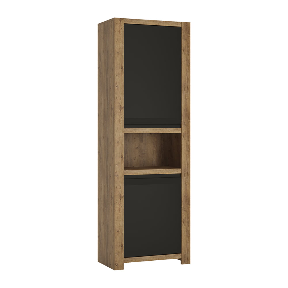 2 door tall cupboard with open shelf in Lefkas Oak with matt black fronts. Tall cabinet with internal adjustable shelving, plus a open shelf to show your hidden treasures. This traditional yet contemporary, stylish yet functional range – is stunning elegant and practical and for all modern homes.
