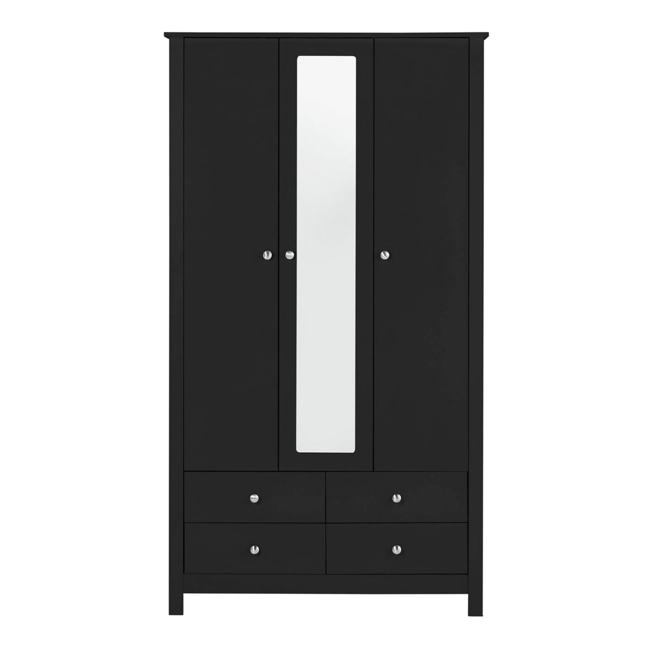 3 Door 4 Drawer wardrobe with mirror in Black is a compact triple robe that combines lots of hanging space over 4 spacious drawers to give the ultimate storage for everyones clothes, beautifully styled to match the rest of this collection. It has three separate doors all with adjustable hinges that open up to reveal loads of hanging space and the four drawers which are perfect for folding clothes, all drawers are on easy glide runners and have cam lok system on drawer fronts. Crafted from black MDF and finished with a smooth lacquer makes this a durable and attractive choice. Why not add a chest and bedside to offer your customer a room to go offer.