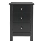 3 drawer bedside in Black in attractive black MDF is an elegantly designed storage solution. It will comfortably hold a lamp, alarm clock and your favourite book or kindle on top and there?s plenty more room in the three drawers. All drawers are on easy glide runners with cam lok system on fronts, and are complimented by the striking metal handles. Modern shaker design in solid black MDF is finished with a smooth lacquer makes this an attractive choice for any bedroom.