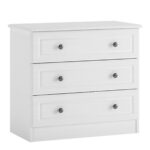 3 drawer wide chest in white textured MDF and white melamine. This wide chest has 3 generous sized drawers, the clever mix of white textured finish and melamine will brighten up any bedroom large or small. This collection, classic with a twist will refresh any size bedroom.
