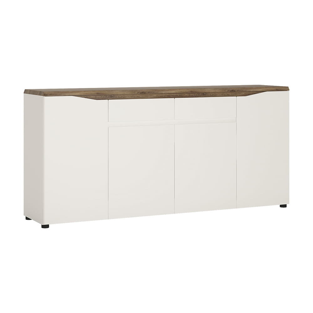4 door 2 drawer sideboard in Alpine White with high gloss fronts and Stirling Oak. Lots of hidden storage space in this modern and large sideboard with 2 drawer, and 4 doors with adjustable internal shelving. This great collection is perfect for lovers of bright and moderne interiors, striking and sophisticated.