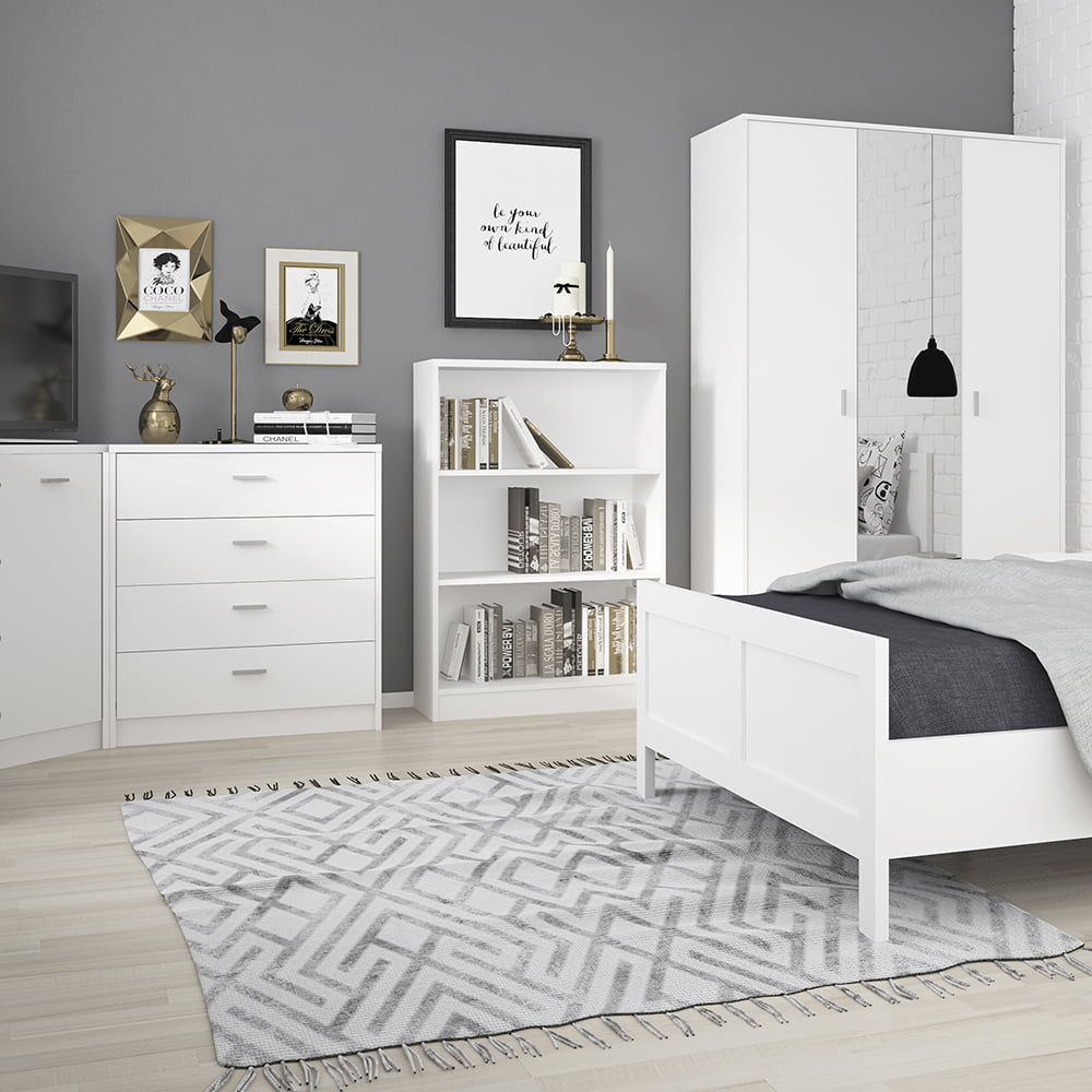 4 Drawer Chest in Pearl White This storage piece perfect for either bedroom or living area, High quality fixings are used in the construction such as Cam fixings on drawer fronts and easy glide metal drawer runners. Why not add one of our other 85 cm high pieces or corner unit to complete your collection.