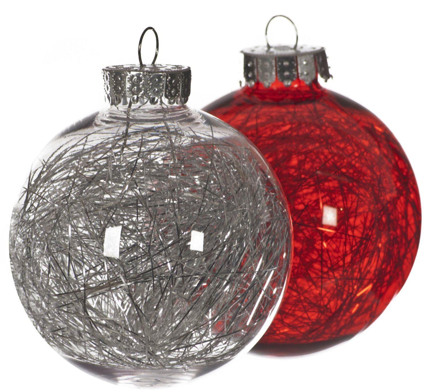 4 Glastic Christmas Bauble Decorations In Red And Silver With Tinsel Effect Inside, Shatterproof.