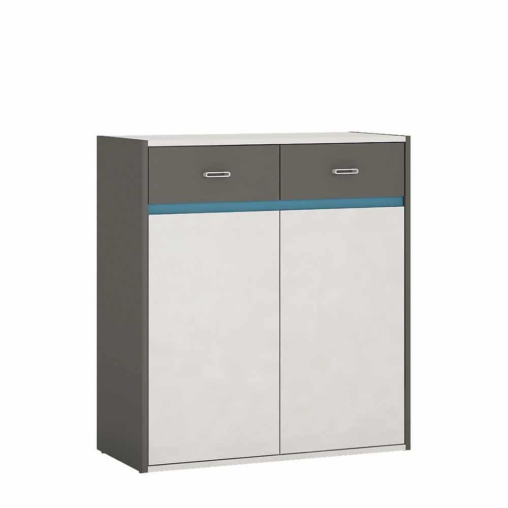 Alien 2 Door 2 Drawer Cabinet in Graphite/Light grey. The fun Alien kids range is finished in modern hard wearing contrasting grey melamines. This compact cabinet has interior shelving behind 2 doors, and 2 handy drawers, includes choice of Blue, green or orange trim.