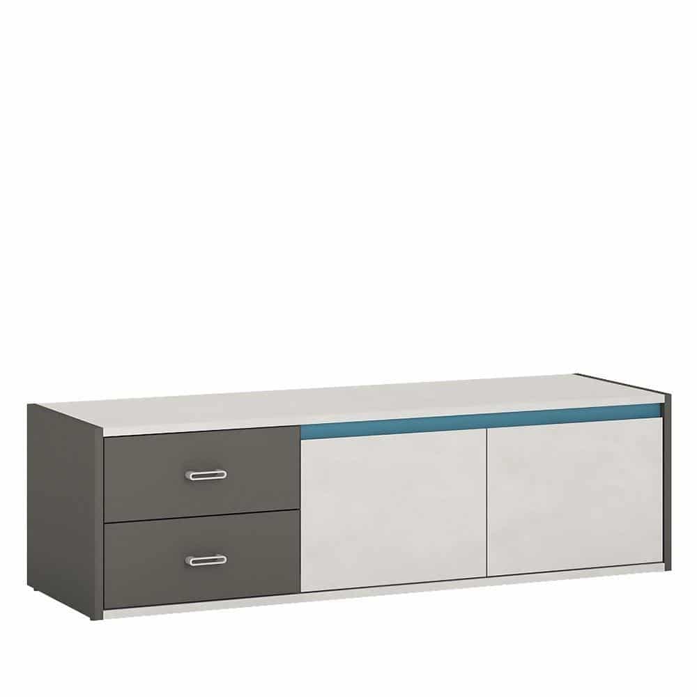 Alien 2 door 2 Drawer TV Cabinet in Graphite/Light grey The fun Alien kids range is finished in modern hard wearing contrasting grey melamines. Stylsh low 2 drawer 2 door TV cabinet, includes choice of Blue, green or orange trim.