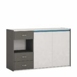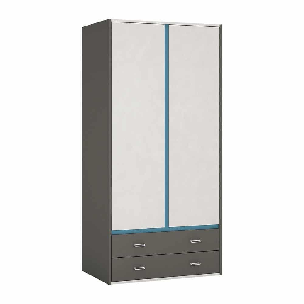 Alien 2 Door 2 Drawer Wardrobe in Graphite/Light grey. The fun Alien kids range is finished in modern hard wearing contrasting grey melamines. This 2 door wardrobe is fitted inside with lots of adjustable shelves and has 2 handy drawers at base, includes choice of Blue, green or orange trim.