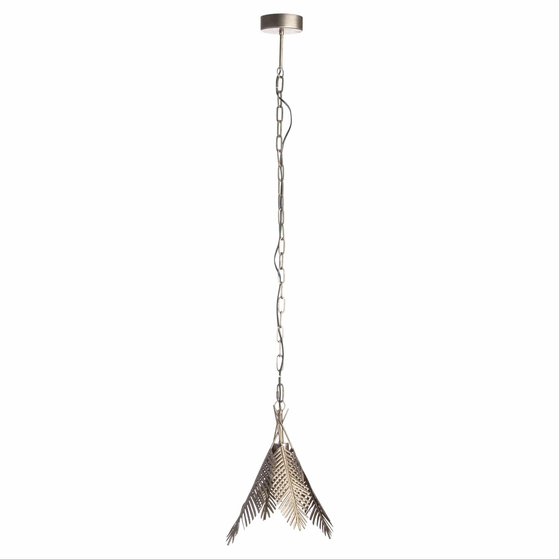 A tropically inspired statement ceiling pendant, handcrafted from an antique silver finished metal. With fanned palm fronds, this sculptural and decorative pendant light conjures up images of exotic beaches which would surely be a welcome addition within any interior. This item is sure to earn serious style points and be an eye-catching addition casting beautiful leaf shaped shadows when lit. See 20274 for a matching larger version of this item.