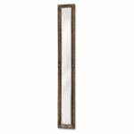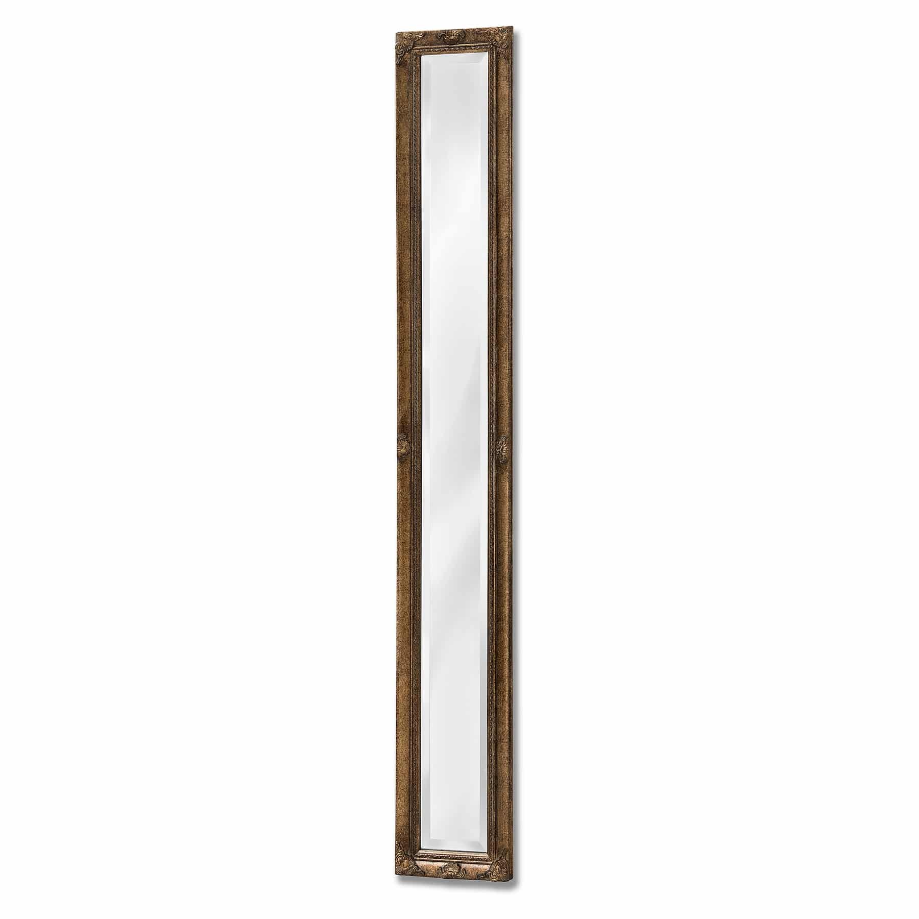 An antique gold wall mirror with raised edges. A versatile piece which can be used to add light and interest to narrow spaces.