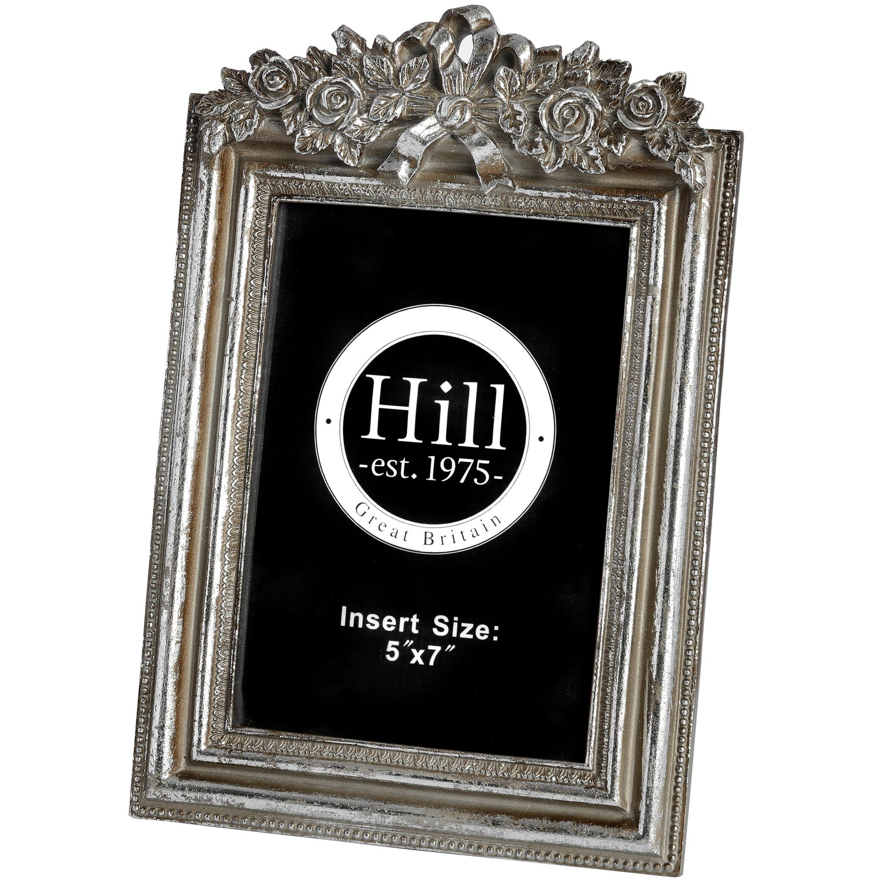 This is an Antique Silver Ribbon Photo Frame that is designed to hold a photo that is 5X7. The frame has an Antique Silver finish that features a ribbon detail.