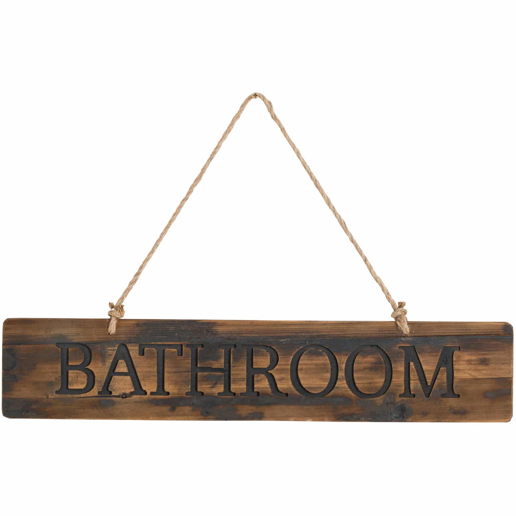 This is the Bathroom Rustic Wooden Message Plaque featuring the simple text of ‘Bathroom’. The text has been engraved on a reclaimed pine board with a hanging rope to create an attractive and rustic wall feature that is sure to add personality and character to any interior. This piece measures 13cm in height and 65.5cm in width..
