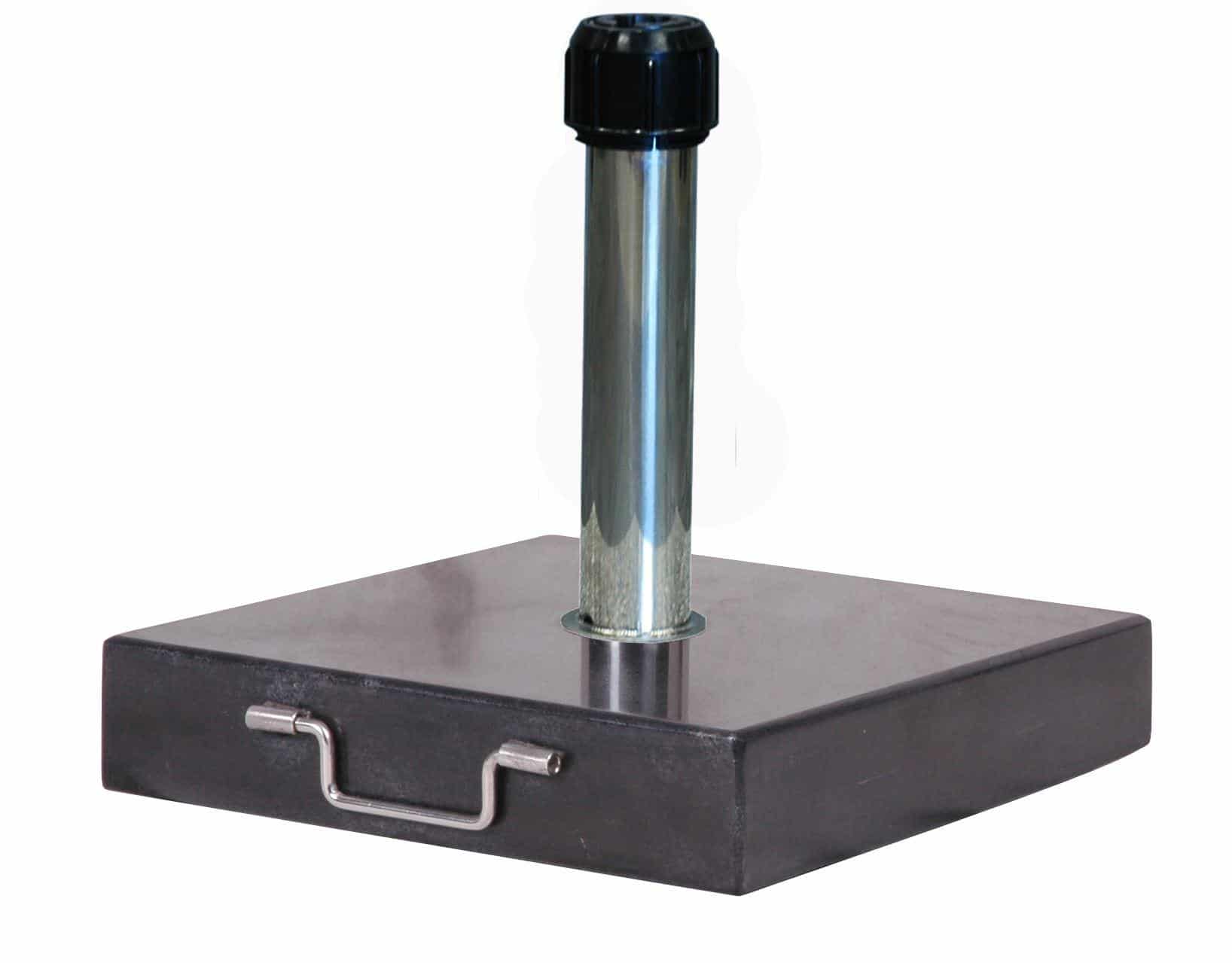 Our parasol bases for center pole parasols are fitted with stainless steel tubes and water drainage. The unique adapter system ensures parasols with a tube diameter up to 48mm are always kept straight. The anti-slip system ensures that the parasol can not spin in the wind. Granite parasol bases are specially selected and offered in polished or burned finish. The optional swivel castors makes your parasol more mobile in the garden.