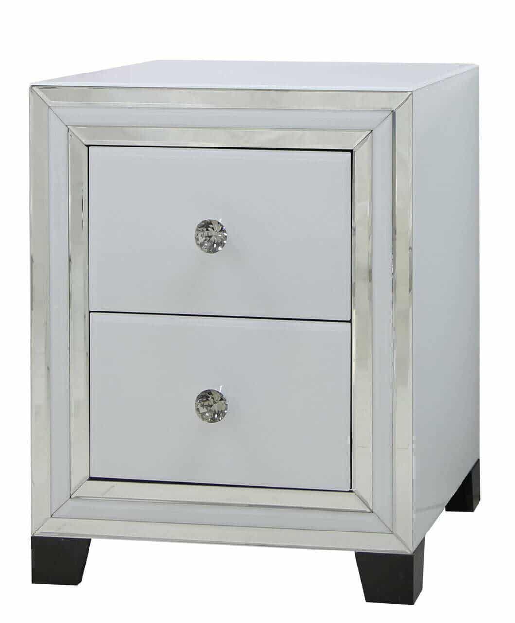 Beautifully crafted 2 drawer bedside cabinet with white & clear mirrored surround. Modern and stylish addition to any room when used as a bedside cabinet or even a lamp table.