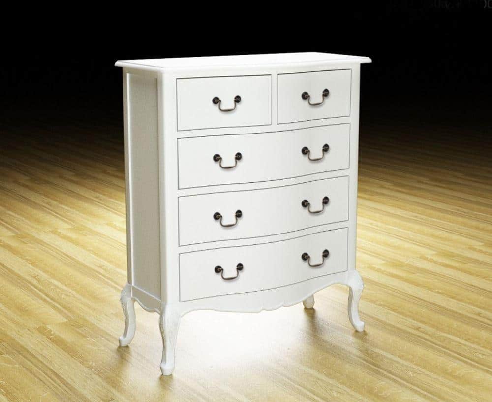 This antique white furniture range is manufactured from a blend of soft wood and MDF, with a matt white finish. Add a touch of class to your bedroom with the Charlotte range. Dimensions: W 90 x D 43 x H110cm.