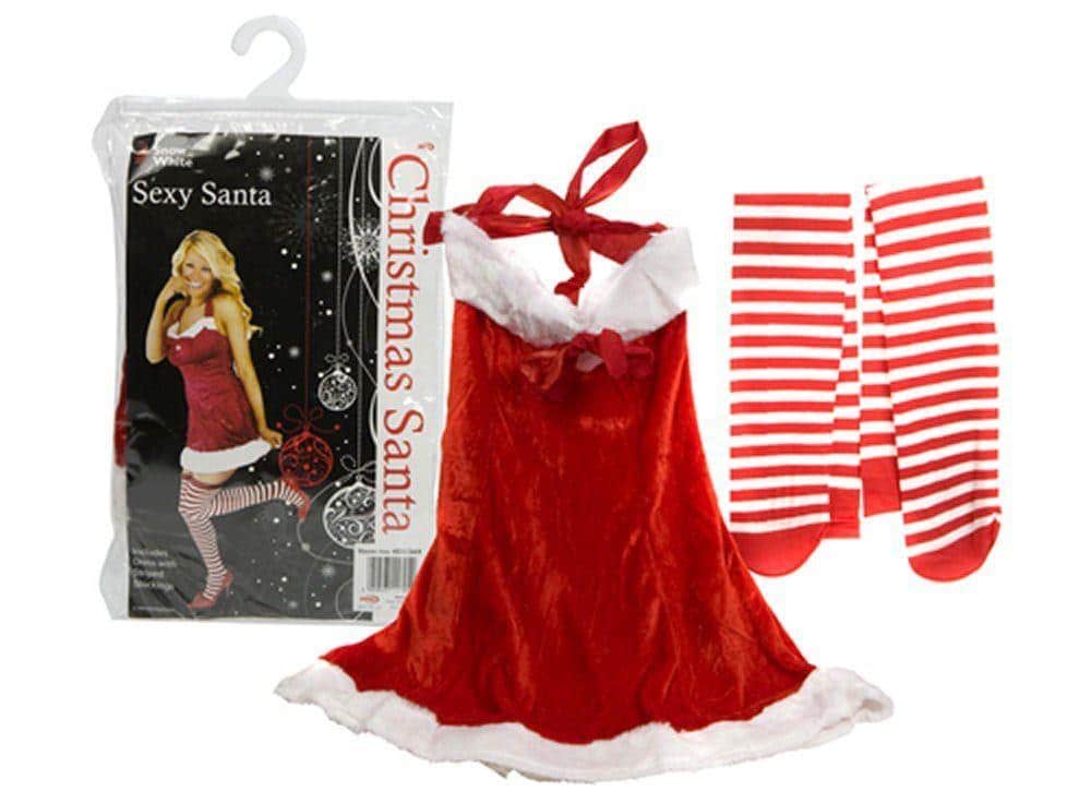 A fun, red velvet dress with white trim and bowknot on the front and a pair of striped stockings. Dress is a stretchy fabric with a zip fastening at the back, in one size only. Measures approx. 30cm across the chest by 55cm in length. Please note there is no internal chest support for large women!