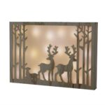 KEY FEATURES – The laser cut wintery forest scene with snowmen is enhanced by the 20 x Warm White LEDs that are on copper wire and attached to the inner back panel of the frame. For fixing it to a wall it comes with 2 x keyhole screw holes that are a distance of 24cm apart
