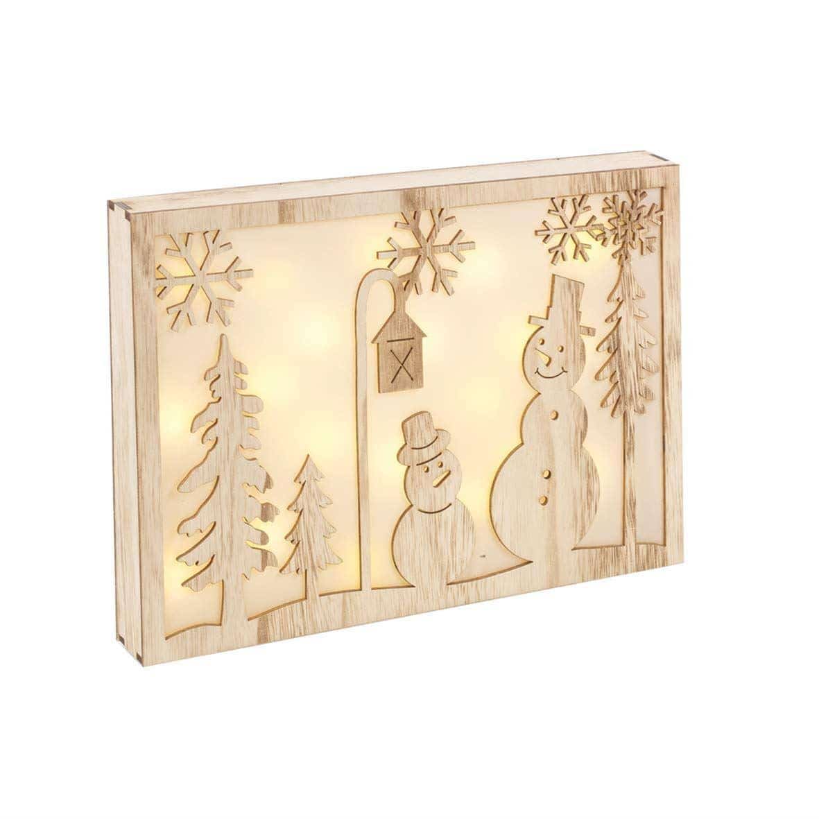 PACKAGE CONTENTS – The Christmas Workshop brings you a LED Wooden Frame with Snowmen Silhouettes cut out.