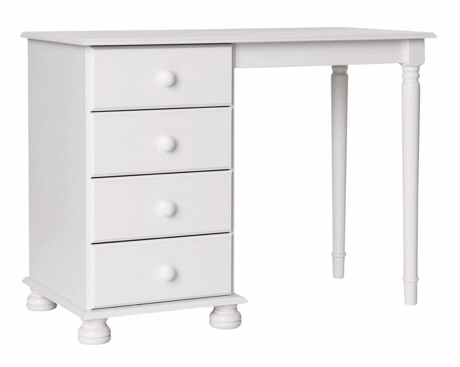 Copenhagen Single Dressing Table in attractive white MDF can be used as a stylish dressing table matching other items from the Copenhagen collection, or as a desk for the single bedroom or home office. The 4 drawers offer plenty of storage space with room on top for a mirror and photos, or as a desk gives plenty of workspace. Gliding runners with cam lok drawer fronts, crafted from white MDF and finished with a smooth lacquer makes this a durable and attractive choice for any bedroom.Size W 1003 x D 475 x H 739 mmSolid White MDFNumber of boxes: 1Top / Base: 16 mmSides: 15 mmFront: 16 mmCam lok drawer frontsMetal drawer runnersWhite wooden handlesPlywood drawer bottomsEasy self Assembly