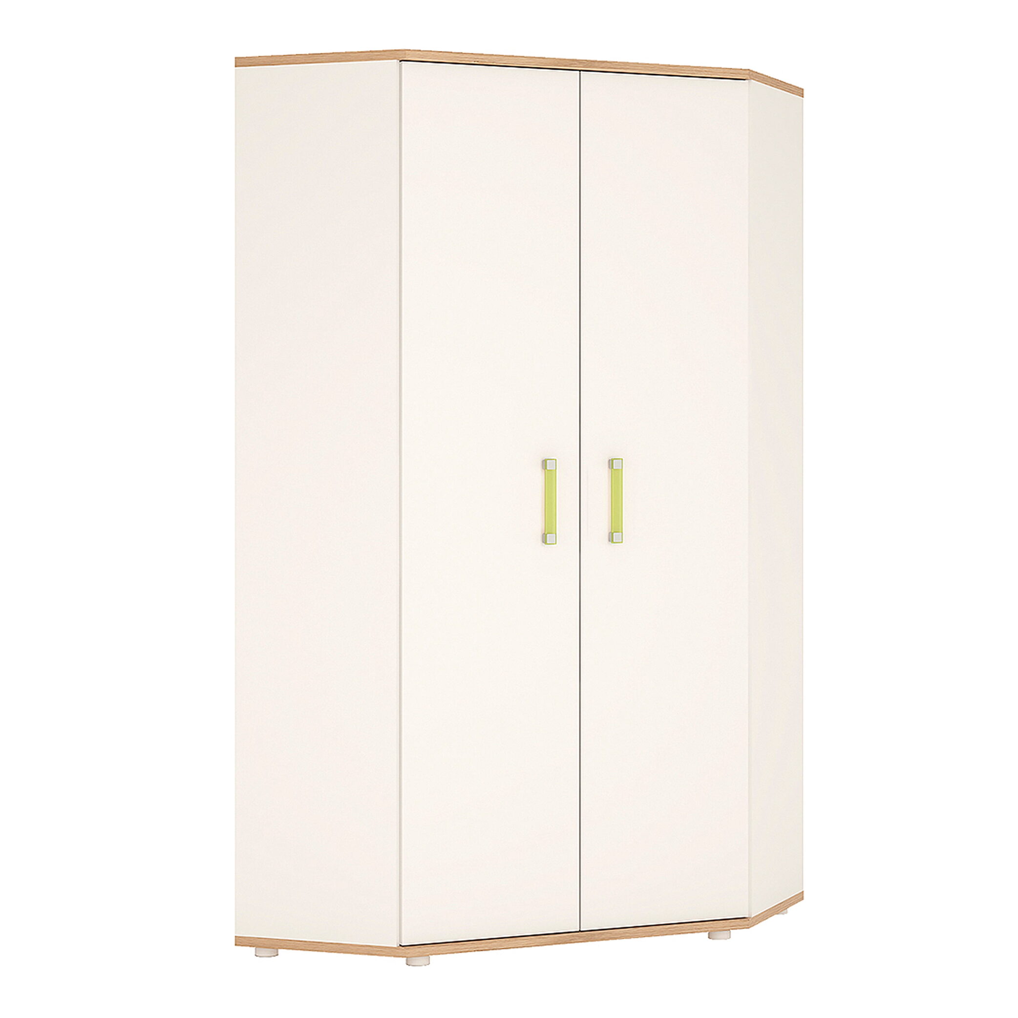 Corner wardrobe in light oak and white high gloss with lemon handles. This neutral and functional kids collection is perfect for all age groups, finished in light oak and stunning white high gloss. Make the most of your space with this corner wardrobe, 2 doors open to reveal acres of storage, adjustable shelving one side and 2 hanging rails on the other.