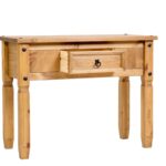 Corona is our most popular Mexican style flat packed furniture range available for easy home assembly featuring a traditional frameCORONA DRESSING TABLE – CR518 – CORONA DRESSING TABLE – CR518 – CORONA DRESSING TABLE – CR518 – CORONA DRESSINCORONA DRESSIN This single pedestal dressing table is made from pine, plywood and has a wax effect finish. It belongs to the Corona range of high quality waxed pine bedroom furniture with real dovetail drawers which we sell at the best possible price. This item requires some assembly and includes all necessary tools. Dimensions: 1025w x 435d x 752h.