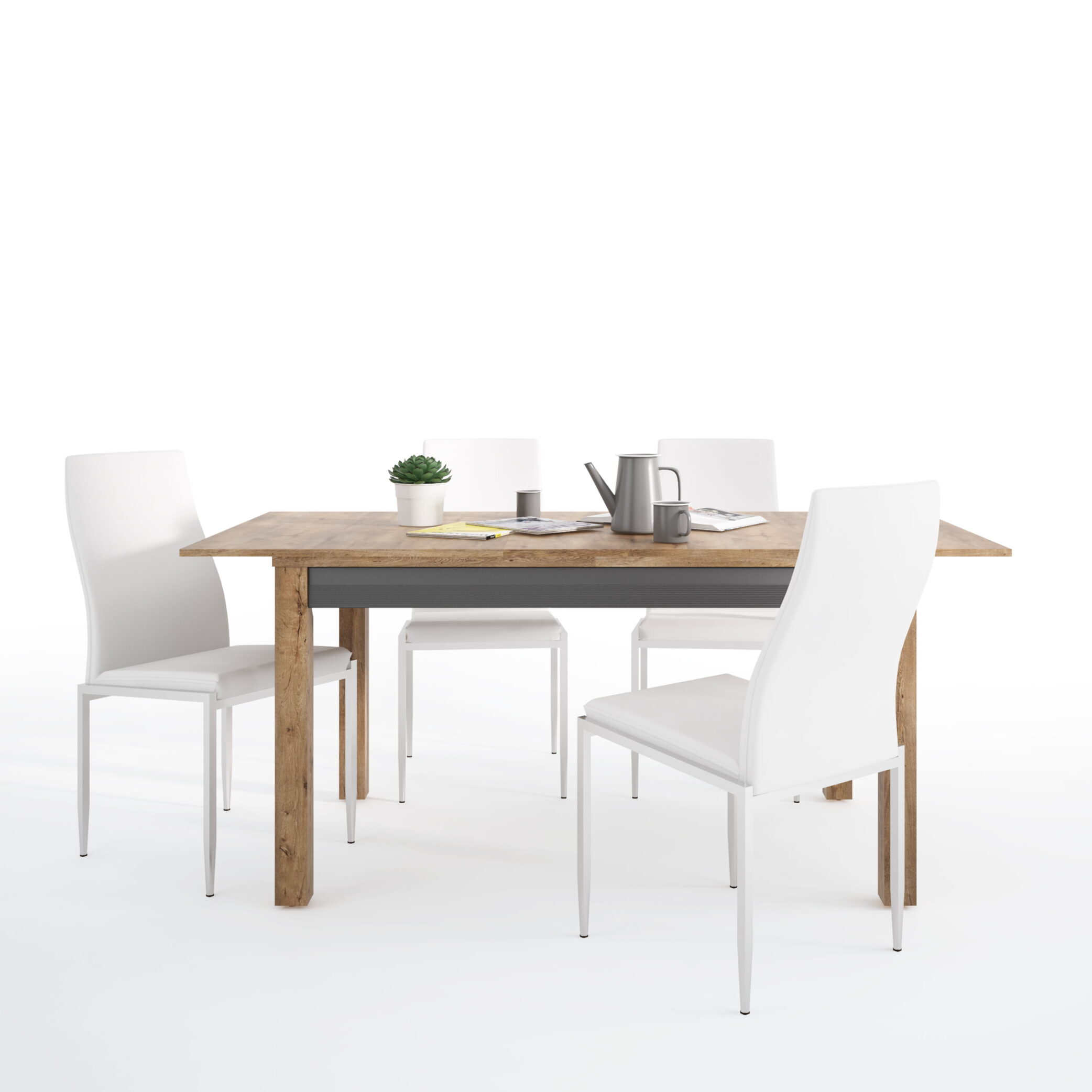 A Beautiful extending dining table with room for the entire family in Lefkas Oak with matt black fronts. This traditional yet contemporary, stylish and functional collection is stunning elegant and practical for all modern homes. This package includes 4x High Back Chairs in White Faux Leather. This stylish dining chair offers a contemporary look; the sturdy Base fashioned from stainless steel giving a shiny chrome look finish and the padded seat and individual shaped back makes this chair extremely comfortable. Material is an extremely hard wearing Faux Leather, this elegant and classic chair will compliment this dining table perfectly! The chairs are already assembled and have a seat height 47.5 cm.