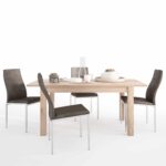 Extending Dining Table in a fantastic grained oak finish with the contrasting dark trim making this a modern top quality collection for your dining or living room. This package includes 4x High Back Chairs in Dark Brown Faux Leather. This stylish dining chair offers a contemporary look; the sturdy Base fashioned from stainless steel giving a shiny chrome look finish and the padded seat and individual shaped back makes this chair extremely comfortable. Material is an extremely hard wearing Faux Leather, this elegant and classic chair will compliment this dining table perfectly! The chairs are already assembled and have a seat height 47.5 cm.