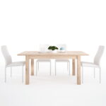 Extending Dining Table in a fantastic grained oak finish with the contrasting dark trim making this a modern top quality collection for your dining or living room. This package includes 4x High Back Chairs in White Faux Leather. This stylish dining chair offers a contemporary look; the sturdy Base fashioned from stainless steel giving a shiny chrome look finish and the padded seat and individual shaped back makes this chair extremely comfortable. Material is an extremely hard wearing Faux Leather, this elegant and classic chair will compliment this dining table perfectly! The chairs are already assembled and have a seat height 47.5 cm.