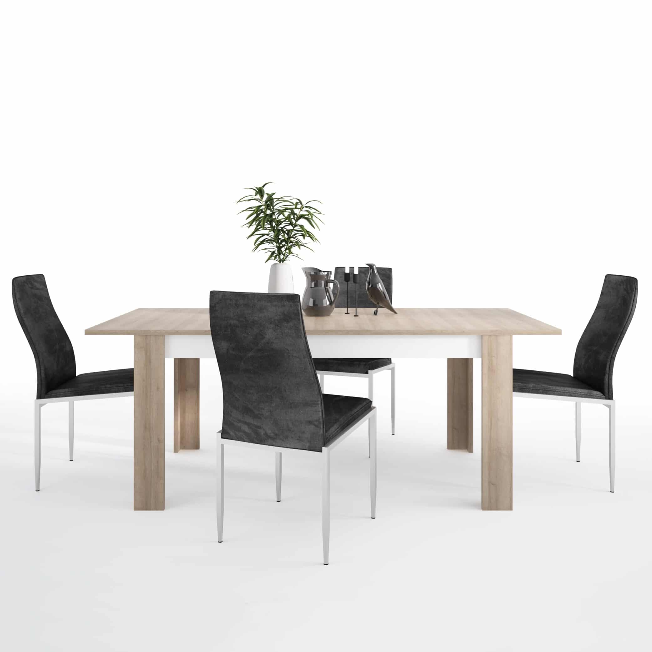 Large extending dining table 160/200 cm in Riviera Oak/White High Gloss. This dining table is available in 3 differant sizes and will be a great edition to any dining room. A high quality collection in a ultra modern design – with each item complementing each other. This package includes 4x High Back Chairs in Black Faux Leather. This stylish dining chair offers a contemporary look; the sturdy Base fashioned from stainless steel giving a shiny chrome look finish and the padded seat and individual shaped back makes this chair extremely comfortable. Material is an extremely hard wearing Faux Leather, this elegant and classic chair will compliment this dining table perfectly! The chairs are already assembled and have a seat height 47.5 cm.