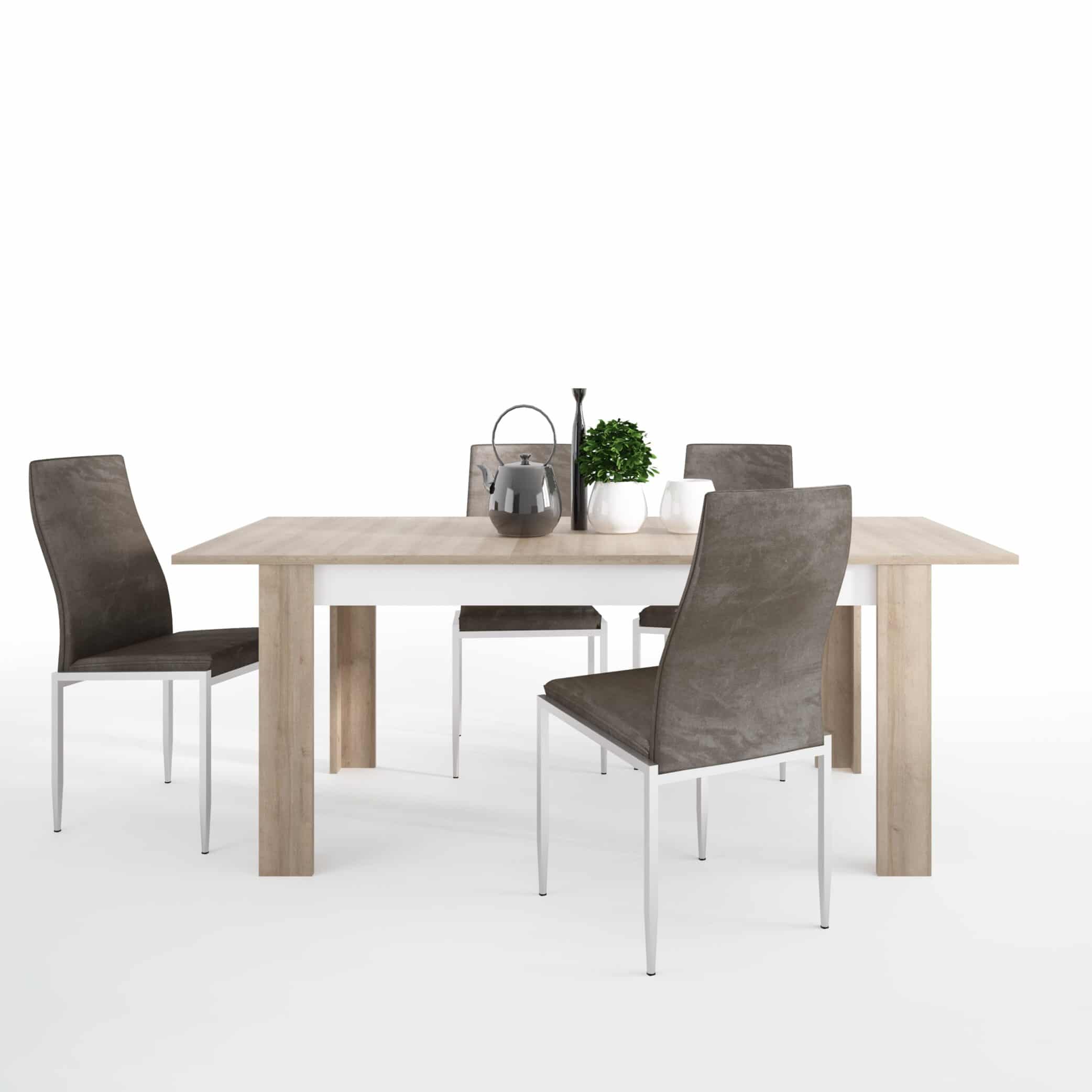 Large extending dining table 160/200 cm in Riviera Oak/White High Gloss. This dining table is available in 3 differant sizes and will be a great edition to any dining room. A high quality collection in a ultra modern design – with each item complementing each other. This package includes 4x High Back Chairs in Dark Brown Faux Leather. This stylish dining chair offers a contemporary look; the sturdy Base fashioned from stainless steel giving a shiny chrome look finish and the padded seat and individual shaped back makes this chair extremely comfortable. Material is an extremely hard wearing Faux Leather, this elegant and classic chair will compliment this dining table perfectly! The chairs are already assembled and have a seat height 47.5 cm.