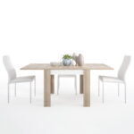 Small extending dining table 90/180cm in Riviera Oak/White High Gloss. This dining table is available in 3 differant sizes and will be a great edition to any dining room. A high quality collection in a ultra modern design – with each item complementing each other. This package includes 4x High Back Chairs in White Faux Leather. This stylish dining chair offers a contemporary look; the sturdy Base fashioned from stainless steel giving a shiny chrome look finish and the padded seat and individual shaped back makes this chair extremely comfortable. Material is an extremely hard wearing Faux Leather, this elegant and classic chair will compliment this dining table perfectly! The chairs are already assembled and have a seat height 47.5 cm.