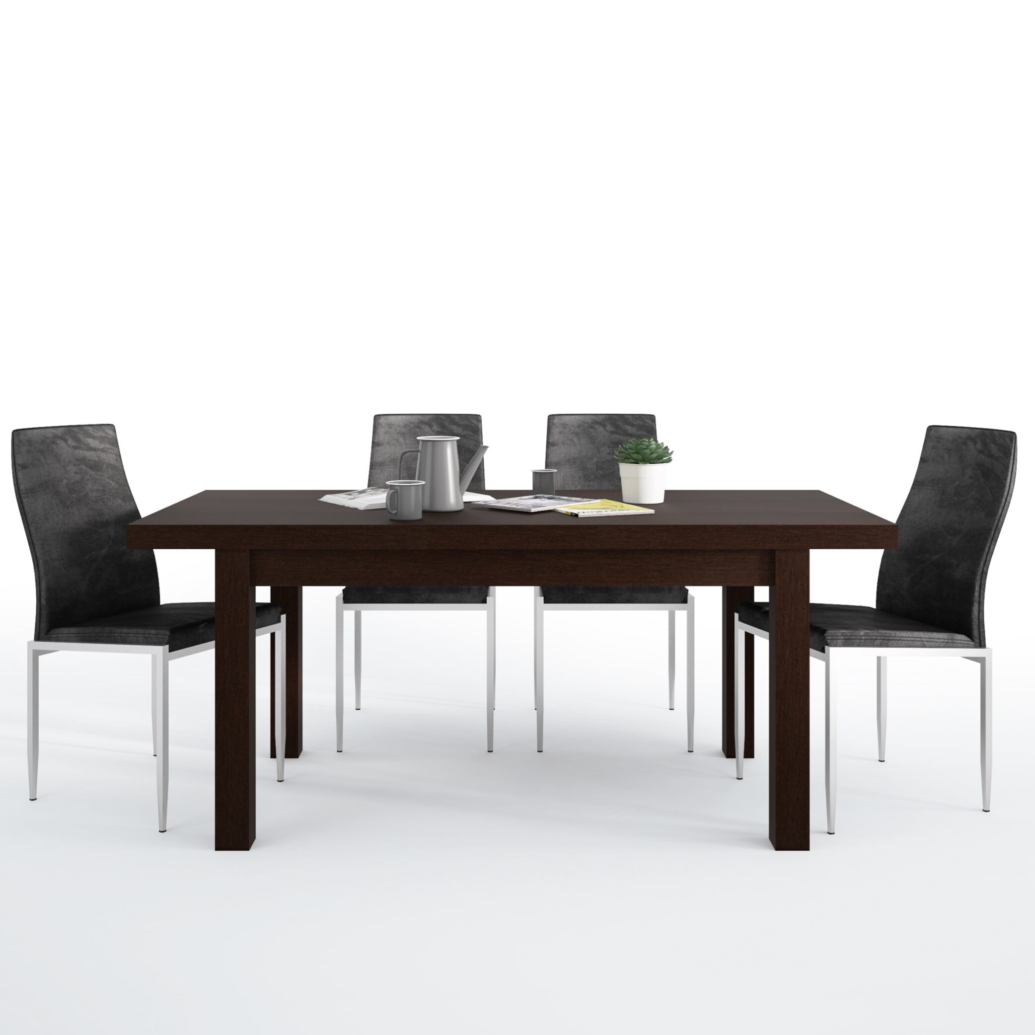 Extending Dining Table in Dark Mahogany simple and elegant collection with laminated board (resistant to damage and scratching, moisture and high temperatures) and modern handle-less system. This modern and simple minimalist collection offers a great range of furniture with storage options as well as an elegant design. This package includes 4x High Back Chairs in Black Faux Leather. This stylish dining chair offers a contemporary look; the sturdy Base fashioned from stainless steel giving a shiny chrome look finish and the padded seat and individual shaped back makes this chair extremely comfortable. Material is an extremely hard wearing Faux Leather, this elegant and classic chair will compliment this dining table perfectly! The chairs are already assembled and have a seat height 47.5 cm.