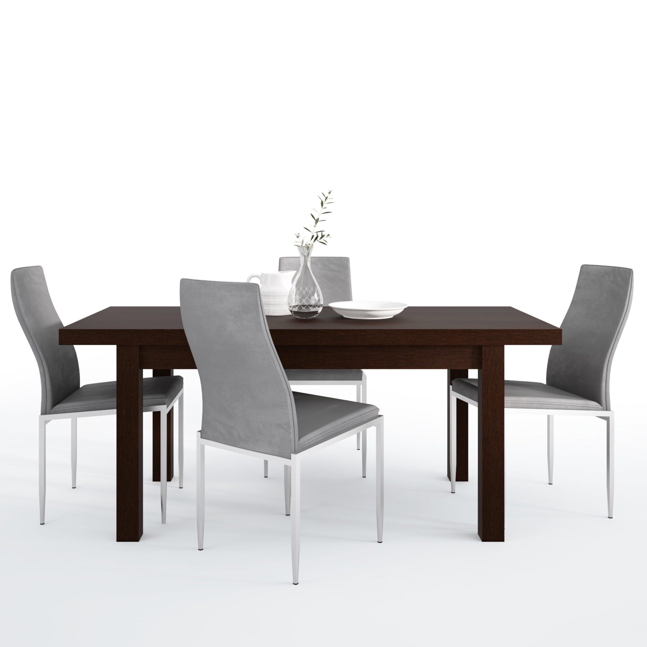 Extending Dining Table in Dark Mahogany simple and elegant collection with laminated board (resistant to damage and scratching, moisture and high temperatures) and modern handle-less system. This modern and simple minimalist collection offers a great range of furniture with storage options as well as an elegant design. This package includes 6x High Back Chairs in Grey Faux Leather. This stylish dining chair offers a contemporary look; the sturdy Base fashioned from stainless steel giving a shiny chrome look finish and the padded seat and individual shaped back makes this chair extremely comfortable. Material is an extremely hard wearing Faux Leather, this elegant and classic chair will compliment this dining table perfectly! The chairs are already assembled and have a seat height 47.5 cm.