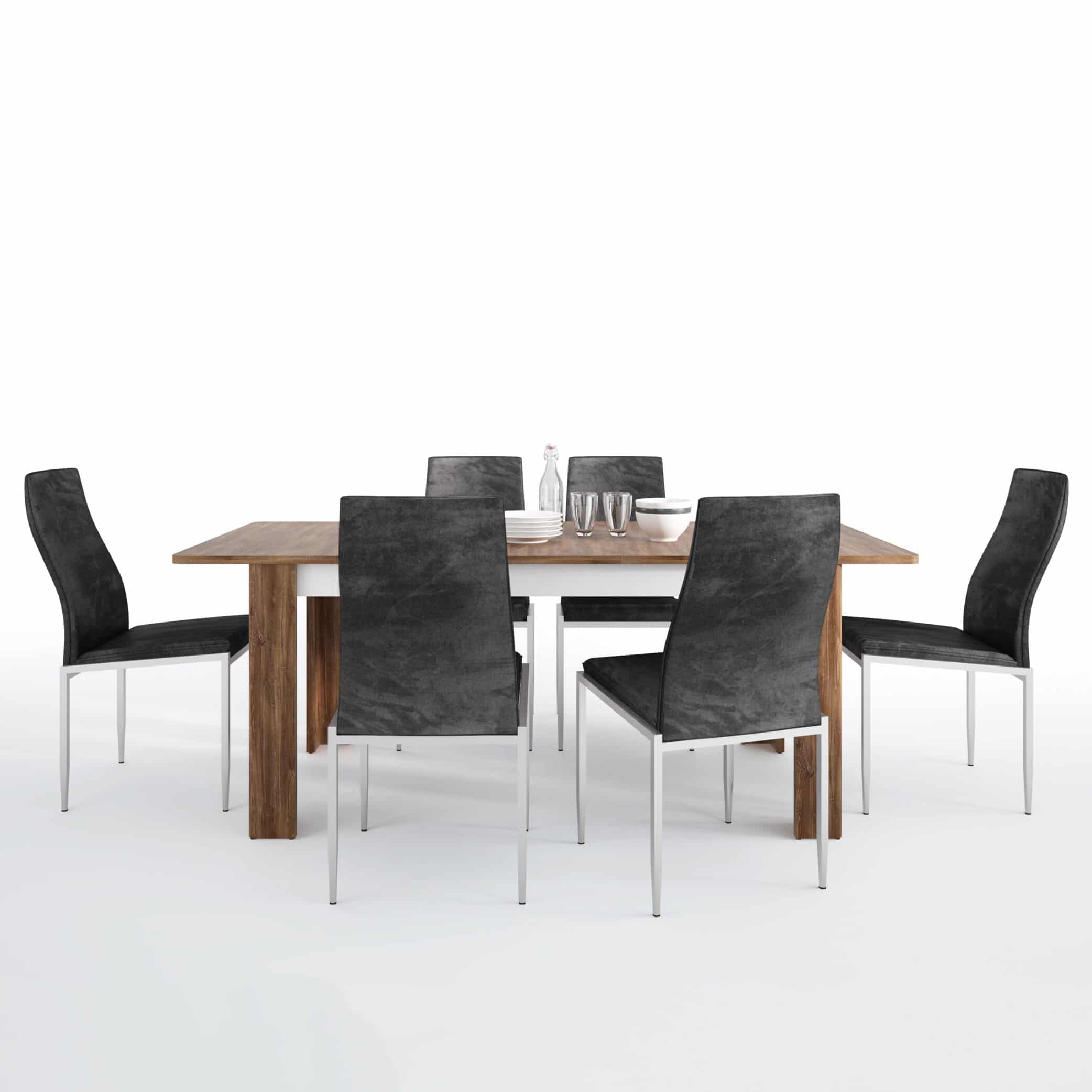 Extending dining table in Alpine White with high gloss fronts and Stirling wooden Oak finish. Great heat and scratch resistant table top, perfect for todays modern dining rooms. This great collection is perfect for lovers of bright and modern interiors, striking and sophisticated. This package includes 6x High Back Chairs in Black Faux Leather. This stylish dining chair offers a contemporary look; the sturdy Base fashioned from stainless steel giving a shiny chrome look finish and the padded seat and individual shaped back makes this chair extremely comfortable. Material is an extremely hard wearing Faux Leather, this elegant and classic chair will compliment this dining table perfectly! The chairs are already assembled and have a seat height 47.5 cm.