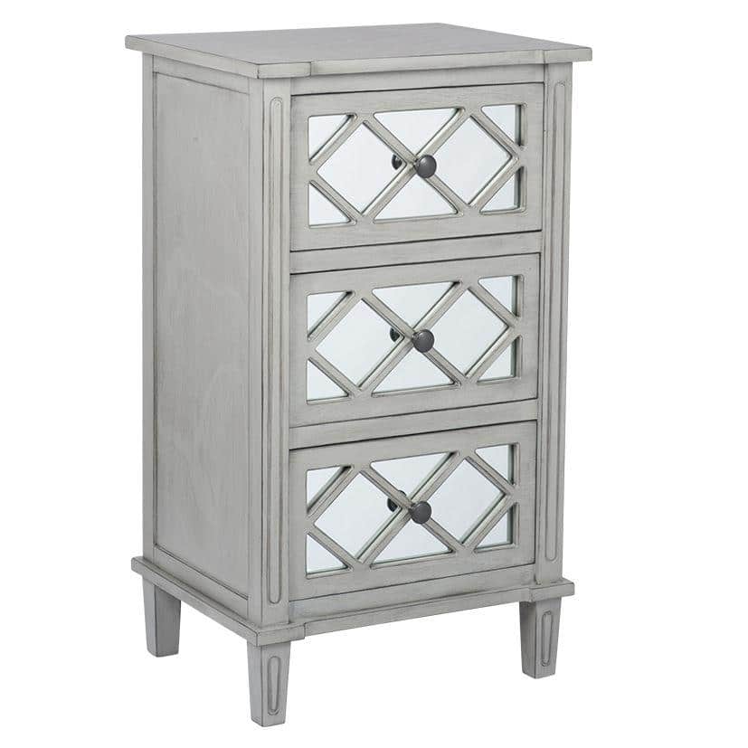 Add a touch of elegance to your home. Finished in a soft grey wood and highlighted with pretty mirrored drawers which have a delicate wood pattern overlay. This 3 drawer unit with its subtle design will stand the test of time. This piece sits beautifully within our Puglia Collection alongside other furniture pieces within this range.