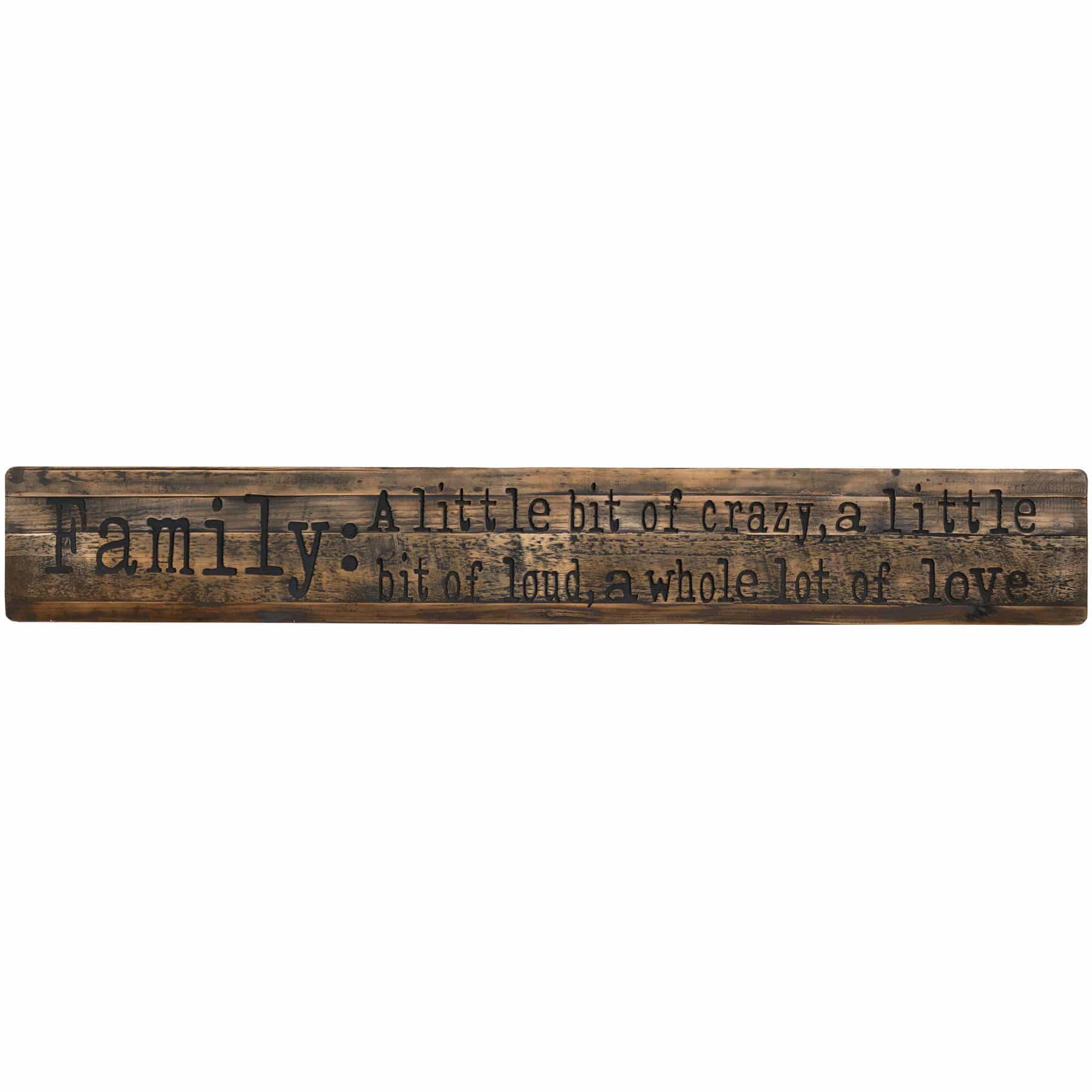 This is the Family Large Rustic Wooden Message Plaque, it features the charming message ‘Family: A little bit of crazy, a little bit of loud, a whole lot of love’. The text has been engraved on a reclaimed pine board to create an attractive and rustic wall feature that is sure to add personality and character to any interior, this piece measures 20cm in height, 139cm in width and 2.5cm in depth.