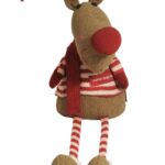 This smiling sitting reindeer is part of the gold Christmas collection. He is knitted in a pale rum gold colour, with a scalf and “Santa’s Helper” badge. He has a weighted base and adjustable antlers. Size approx. 46 x 24cm. Leg length – 30cm.