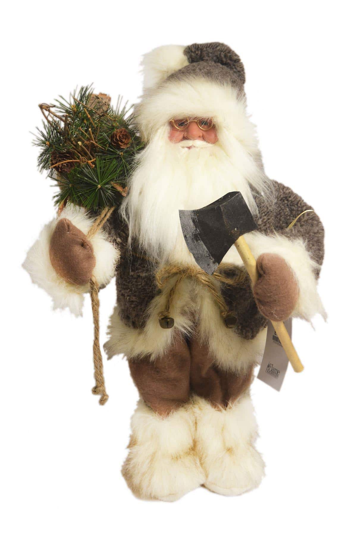 This festive small standing Santa is the perfect indoor decoration. He stands wearing a brown and white fur coat with two bells, carrying an axe in one hand, and a sack of pine tree and cones slung over his shoulder. Part of the gold Christmas collection, this ornament is eye catching, ideal for display this winter. Size approx. 50 x 27cm.