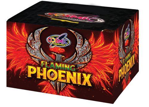 A 80 shot cake ejecting red and green tails which burst with silver palm effects with red, green and yellow peonies and silver strobe bursts with purple and red peonies.