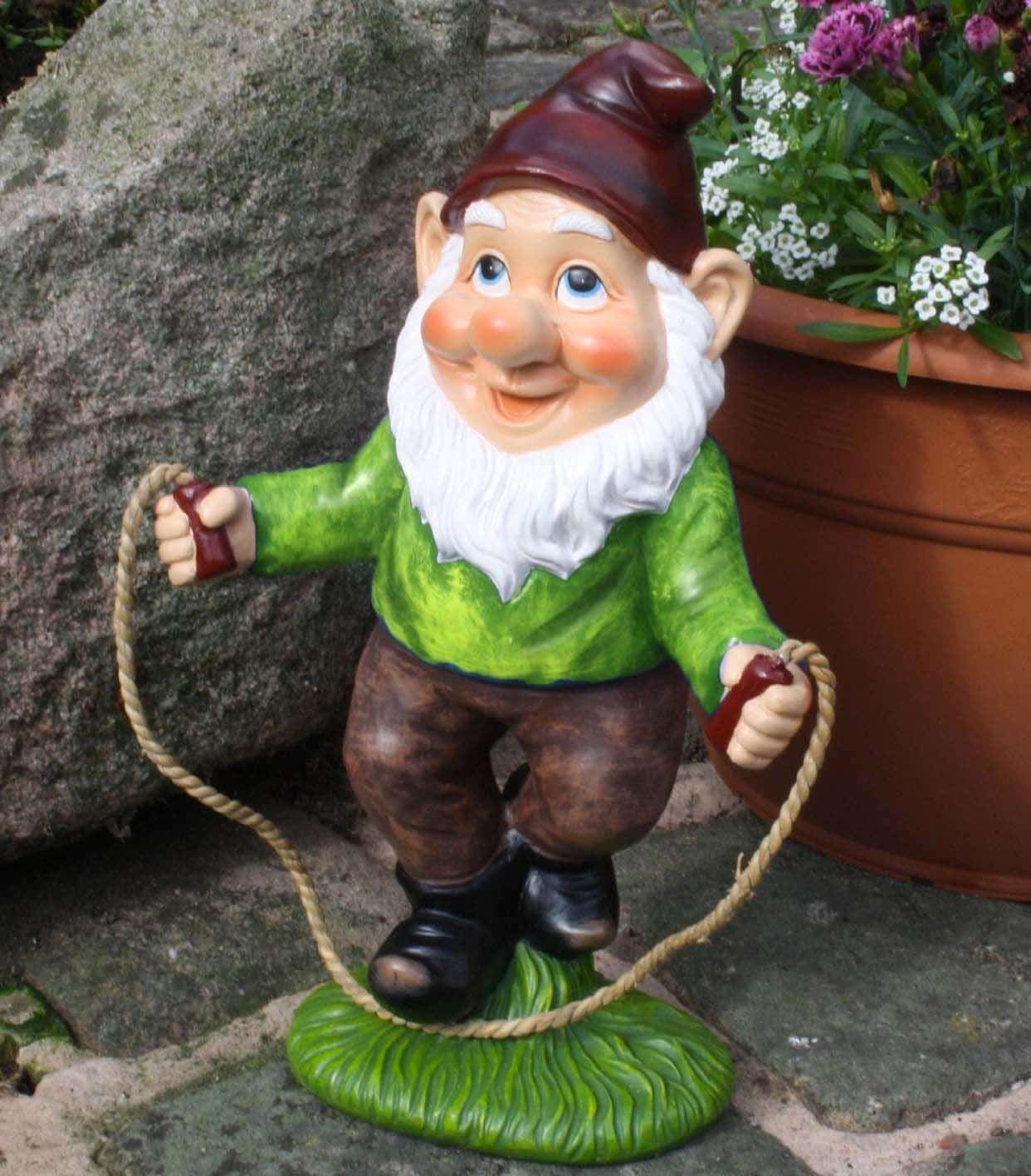 Billy the Skipping Gnome in beautiful bright colours. Fun Garden Ornament to brighten any Plant pot. Hand Painted Resin garden ornament. Makes ideal gift for adults or children. Indoor or outdoor use. (Please note this is not a toy).