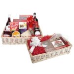 Set includes: Woven wicker style basket, red bow, cellophane wrap and red wood wool filling.