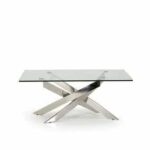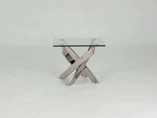 The Kalmar Glass End Table is crafted from tempered glass and stainless steel.