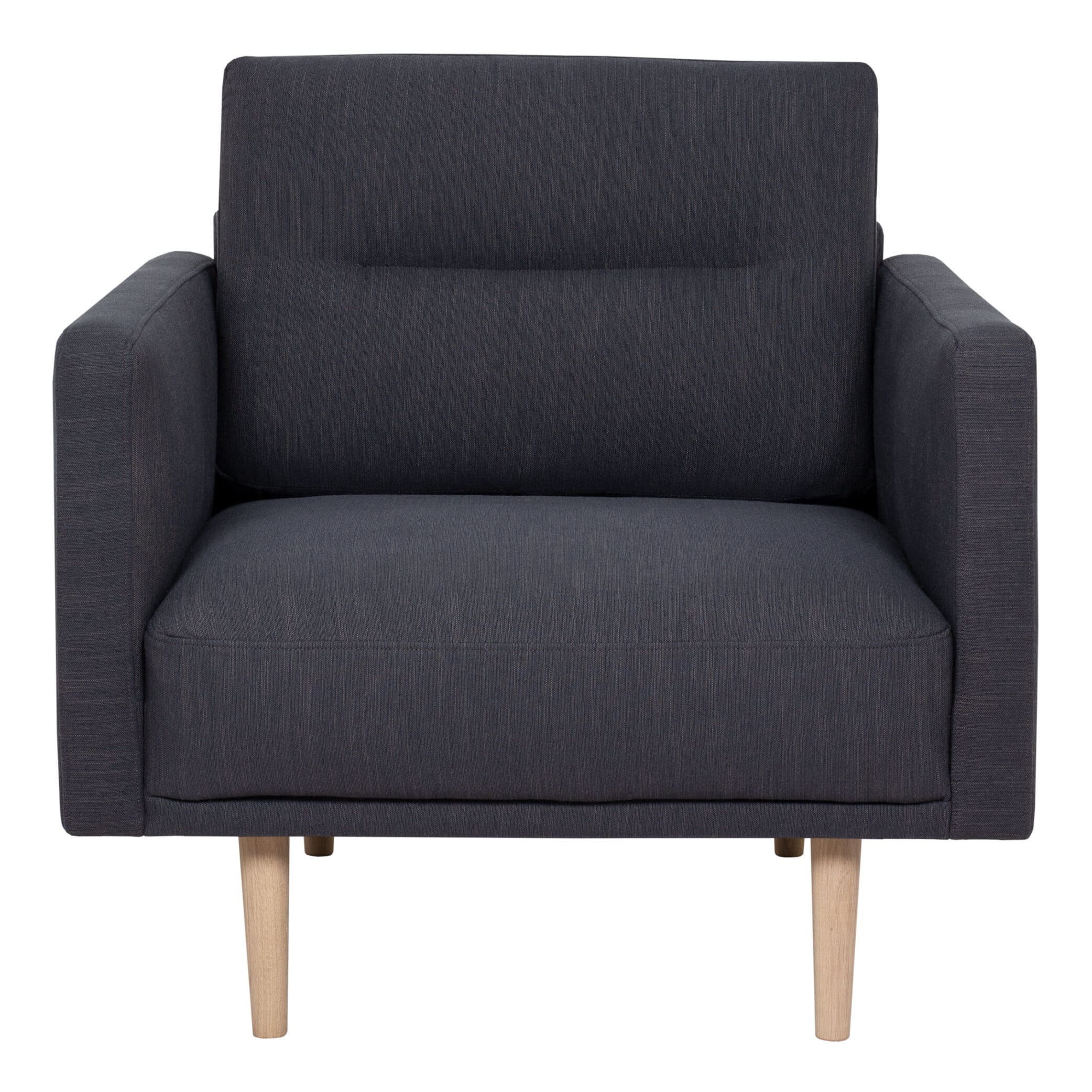 Armchair in Soul Antracit with oak legs. A modern inspired design, kept sleek and angular with slim legs. Comfort has not been sacrificed for design, with its comfy back cushions and wide armrests. All together the perfect and stylish place to spend your evenings.?